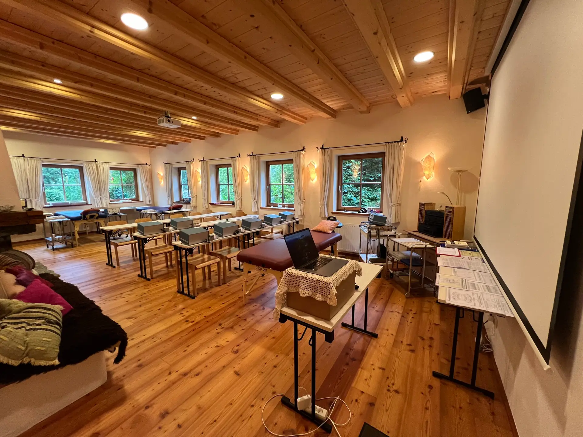 - Ausstattung: Deckenbeamer für Mac., Internetzugang, Leinwand, Musikanlage, Flipchart, Pinnwände sowie Backjack-Bodenstühle, Matratzen und Decken für bodennahes Arbeiten. Bestuhlung in beliebigen Formen und Seminartische.