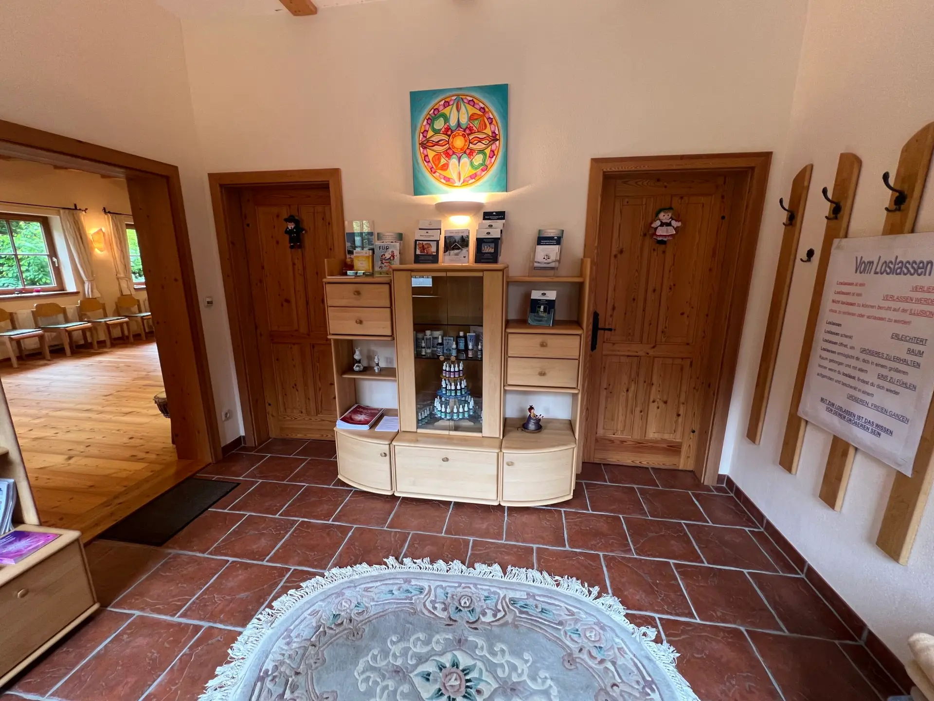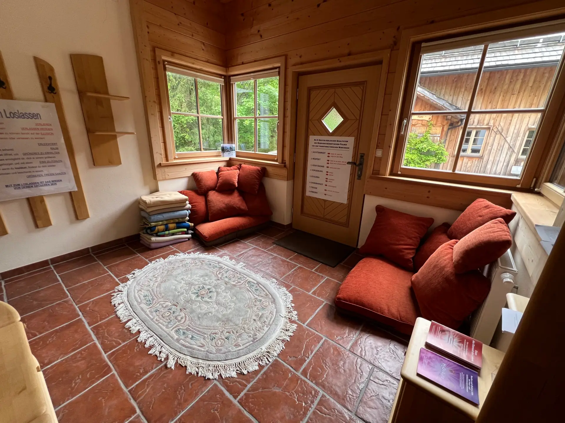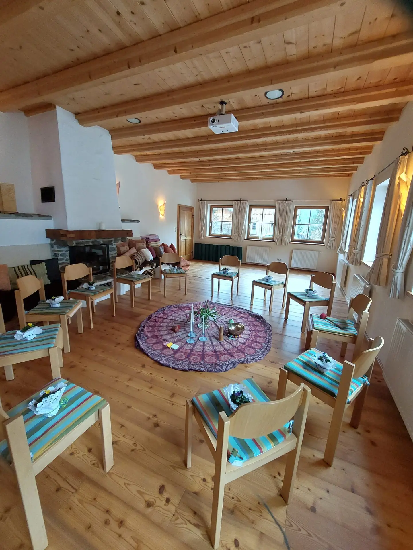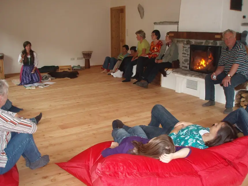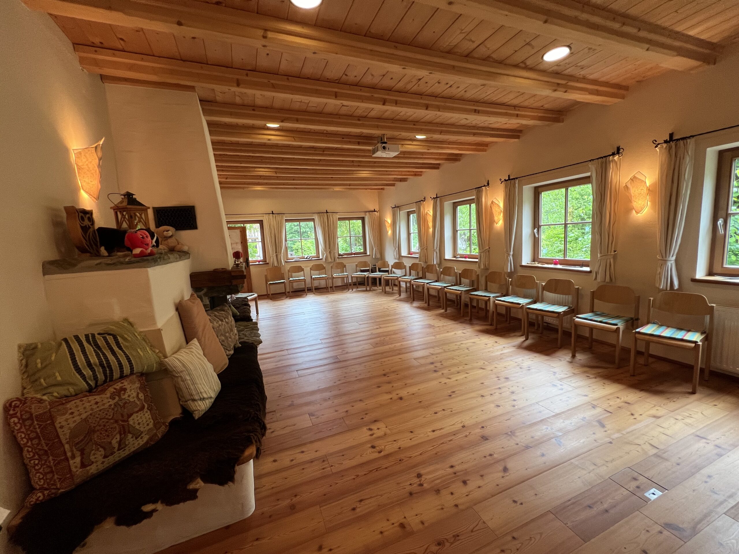 Unser 60 m² großer Seminarraum, mit einem Kachelofen und offenem Kamin im Heilkräuterhaus, bietet ein natürliches Ambiente für Yoga, Fastengruppen, Schulungen für Mediziner oder Bewusstseinstrainings.