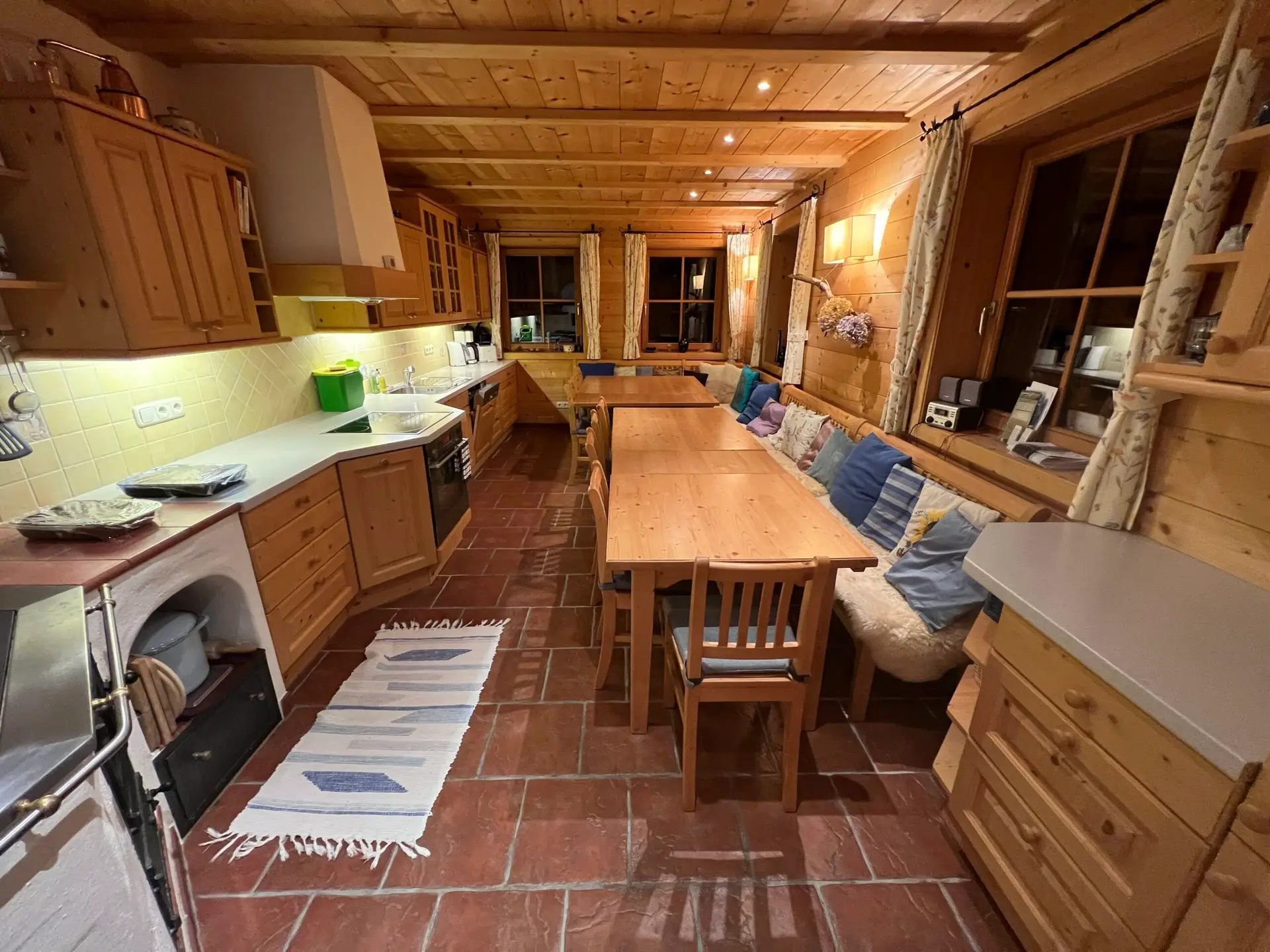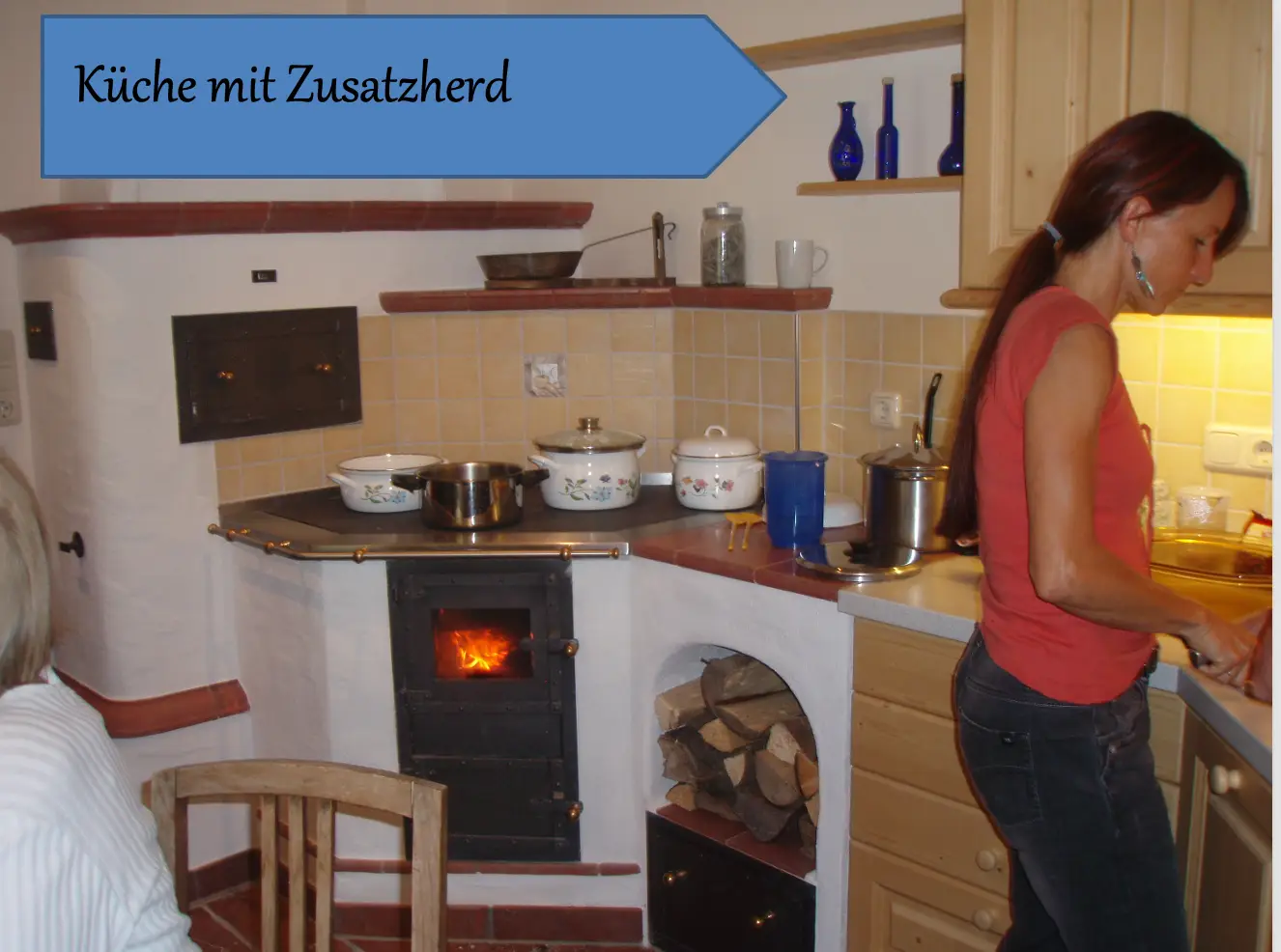 - Ausstattung: Jedes Zimmer verfügt über ein eigenes Bad (Badewanne oder Dusche) und WC. Die voll ausgestattete Küche mit Elektroherd und Geschirrspüler sowie ein Holzofenzusatzherd steht für das gemeinsame Kochen bereit.