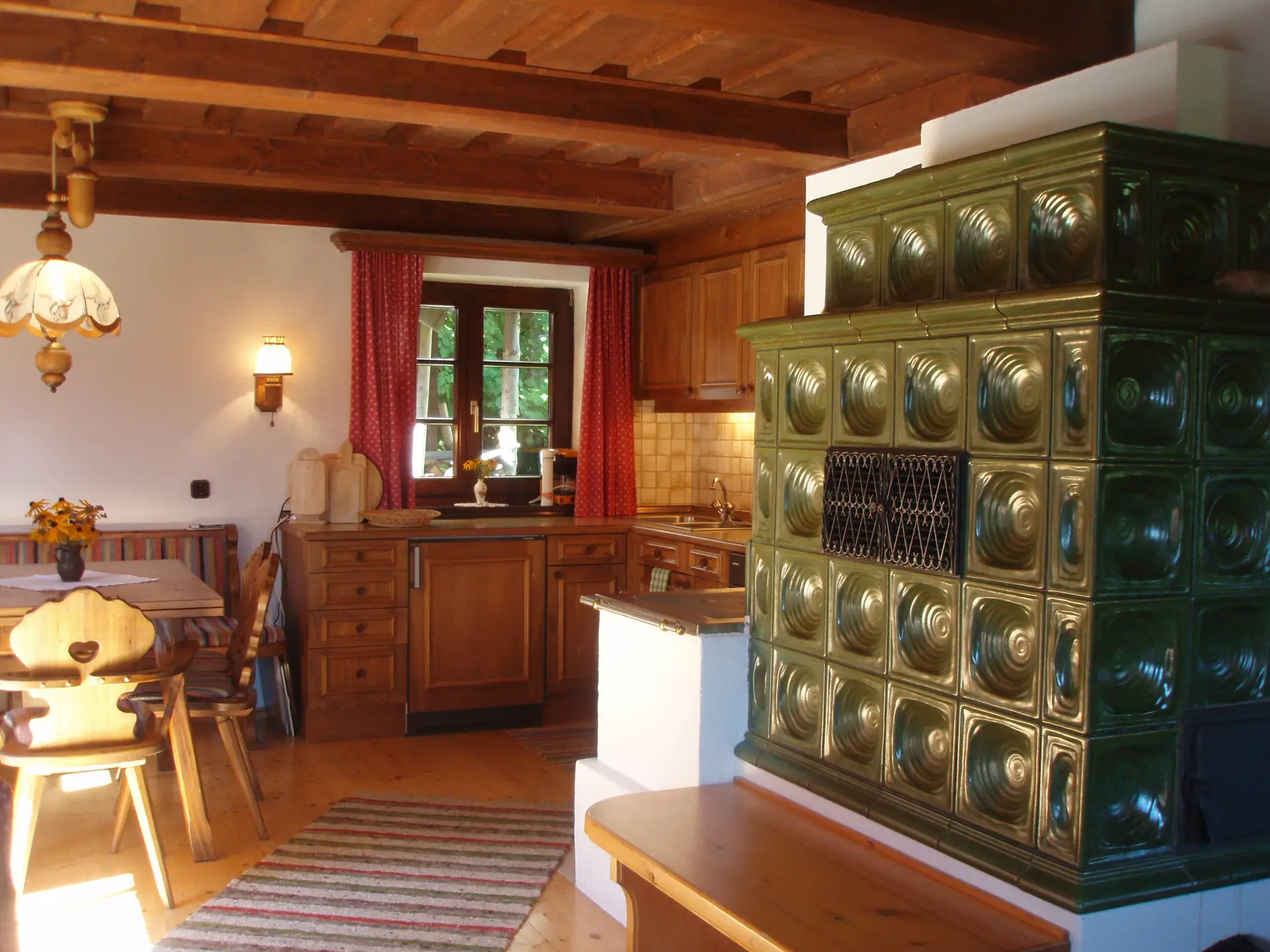 - Das Herz des Hauses: Eine geräumige Wohnküche mit traditionellem Kachelofen, Zusatzholzherd, aber auch ein Elektroherd und Kühlschrank, gemütlicher Essecke und einer Kuschelecke zum Entspannen.